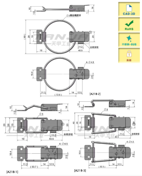 搭扣獨(dú)特的自鎖機(jī)構(gòu)設(shè)計(jì),防止搭扣在使用過(guò)程中彈開(kāi),使用方便安全