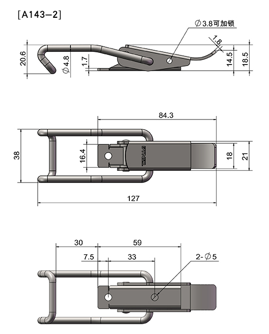 A143-2:弧形彈簧鋼線使搭扣具有彈性預(yù)壓力,并具有減振功能