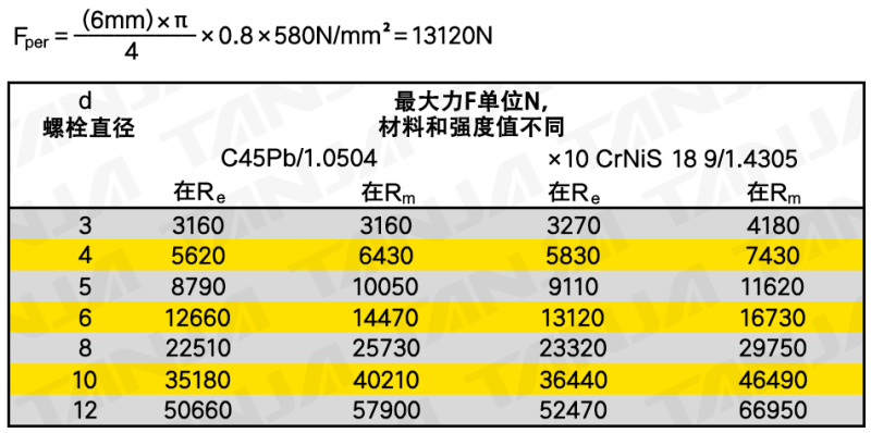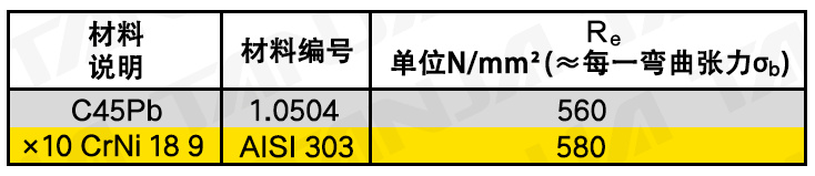 下表所示拉伸強(qiáng)度(Rm)和屈服強(qiáng)度或條件屈服強(qiáng)度(Re / Rp0.2 )為拉伸試樣按照DIN 50125-B6-30標(biāo)準(zhǔn)進(jìn)行拉伸試驗(yàn)后得到的測定值。這些測試數(shù)據(jù)構(gòu)成了此處給出的承載明細(xì)的基礎(chǔ)。