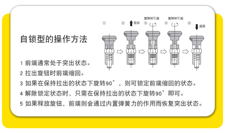 自鎖型旋鈕柱塞的前端一般是凸出的,想要前端縮回,拉出旋鈕并旋轉(zhuǎn)90度,就可以鎖住了,想要解除鎖定,在拉出情況下旋轉(zhuǎn)90度就好了,如果放開旋鈕,前端就會通過內(nèi)置彈簧力的作用恢復。