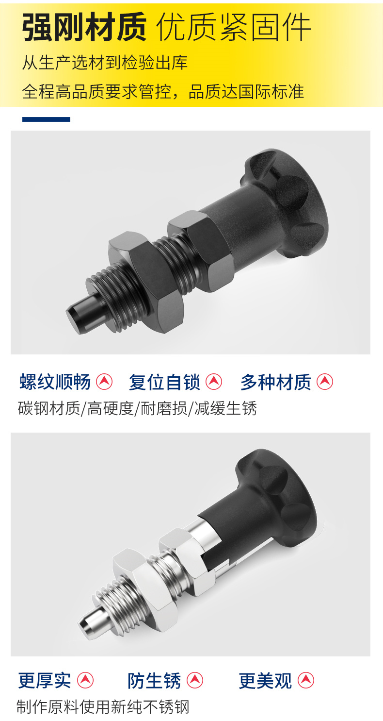 2、旋鈕柱塞安裝靈活:適用于有定位需求的線性運動和旋轉(zhuǎn)運動機構(gòu),通用螺紋安裝即可,拆裝方便