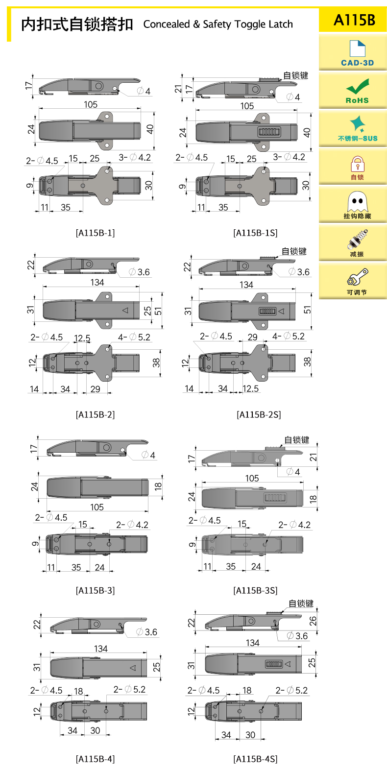 | A115B-4S | 134 | SUS304 | 142.31 | 300 | 4000 | 內(nèi)扣式,自鎖 | 下載 |