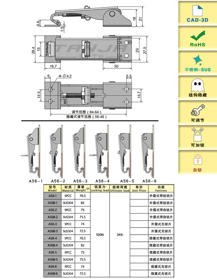 | A56-1 | 81.3 | SPCC | 76.93 | 500 | 2000 | 內(nèi)扣式,可調(diào)節(jié),帶鎖 | 下載 | ||||