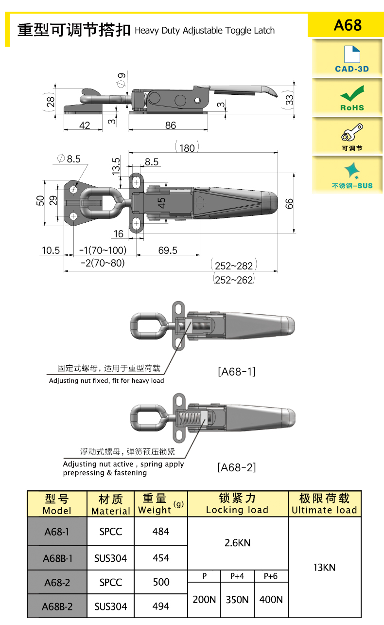 搭扣A68-1,無壓縮彈簧,調(diào)節(jié)螺母固定,可保持對連接體的剛性預(yù)壓