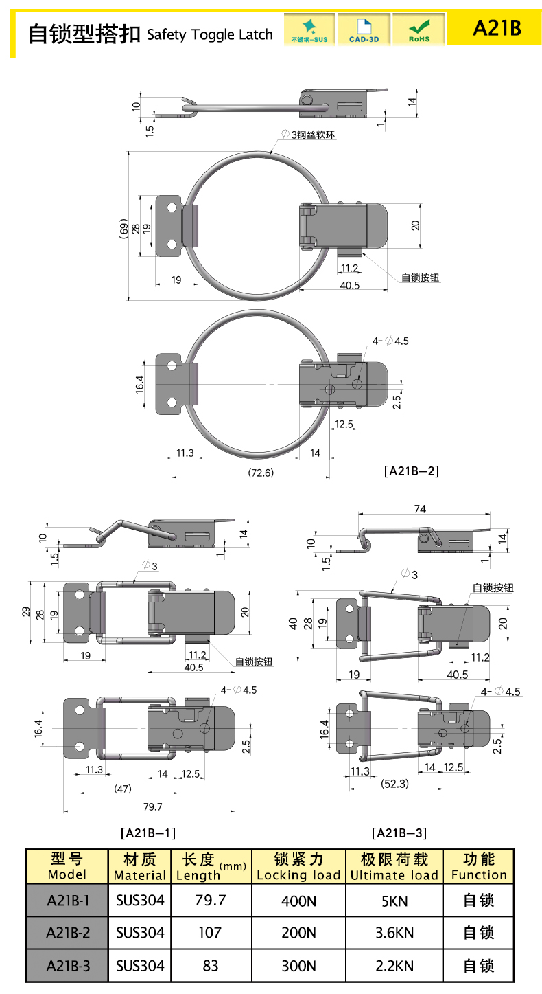 搭扣獨(dú)特的自鎖機(jī)構(gòu)設(shè)計(jì),防止搭扣在使用過程中彈開,使用方便安全