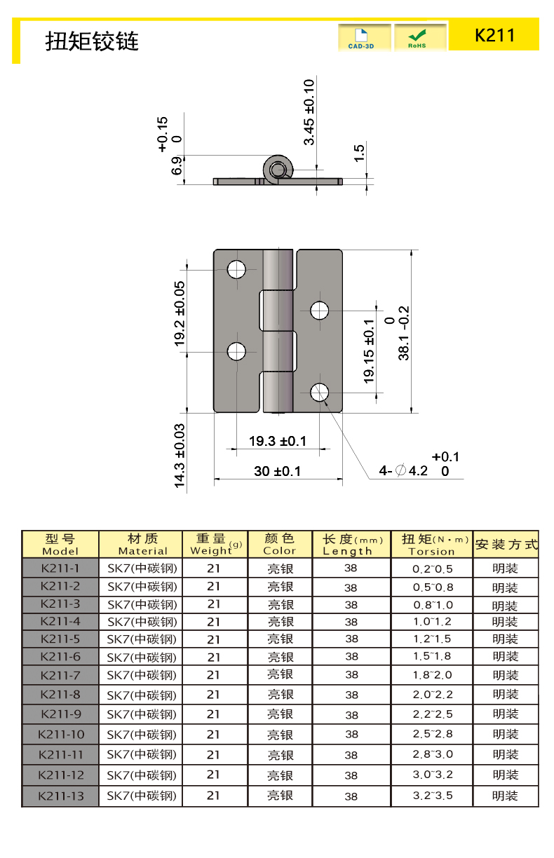 | K211-6 | SPCC | 38 | 銀白 | / | 固定扭矩 | 下載 | ||||
