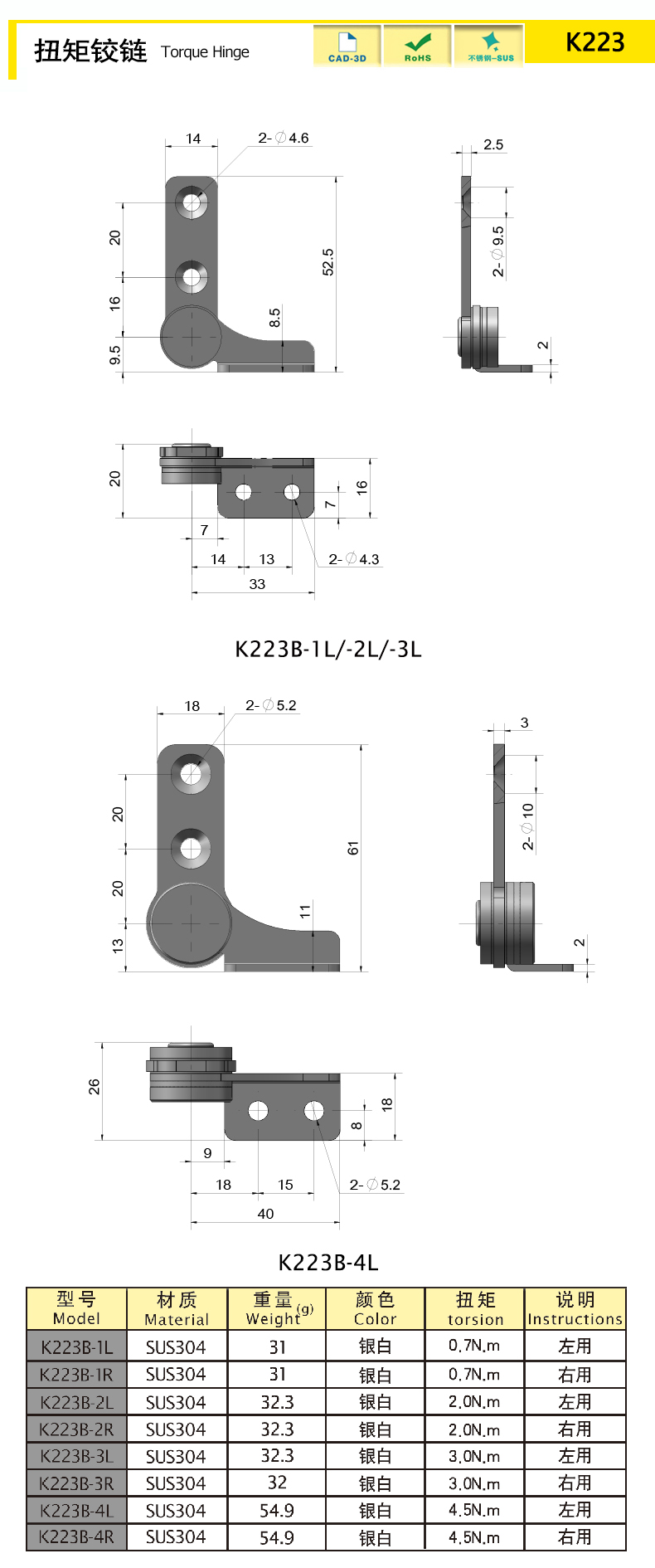 | K223B-3L | SUS304 | 銀白 | 32.31 | 固定扭矩 | 下載 | ||||