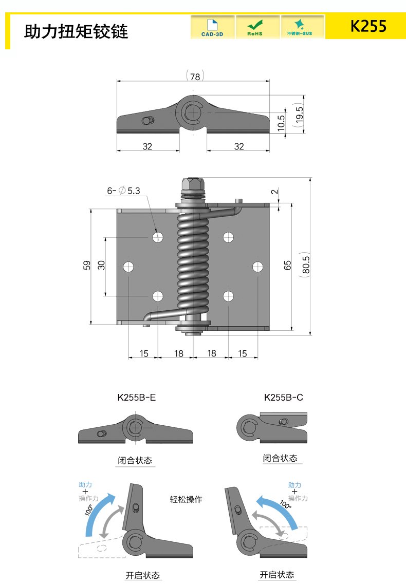 K255B-E外裝助力扭矩鉸鏈;K255B-C:內(nèi)裝助力扭矩鉸鏈