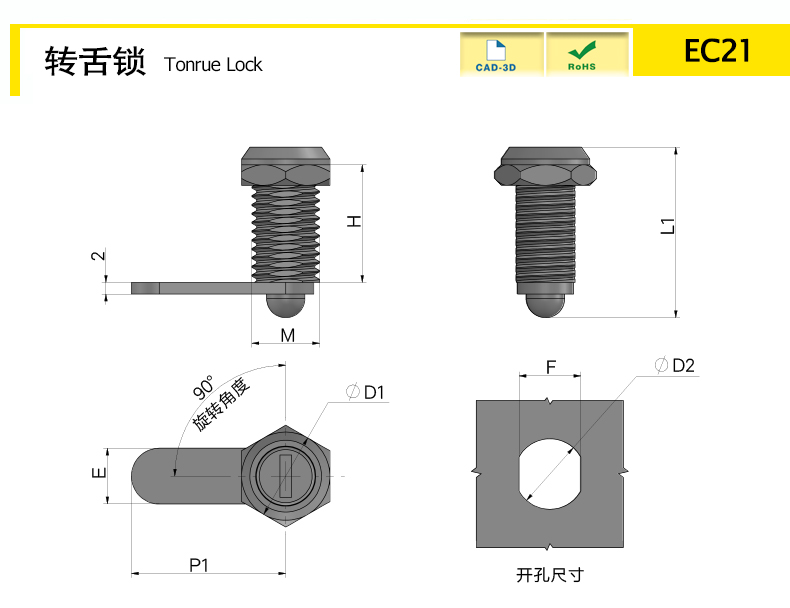 | EC21-M12-16-D | 10.5 | 10 | M12 | 15 | 12 | 圓柱鎖 | 鋅合金 | 16 | 銀白 | 有 | 鍍鉻 | 23.5 | 26 | 24.61 | 下載 | ||||