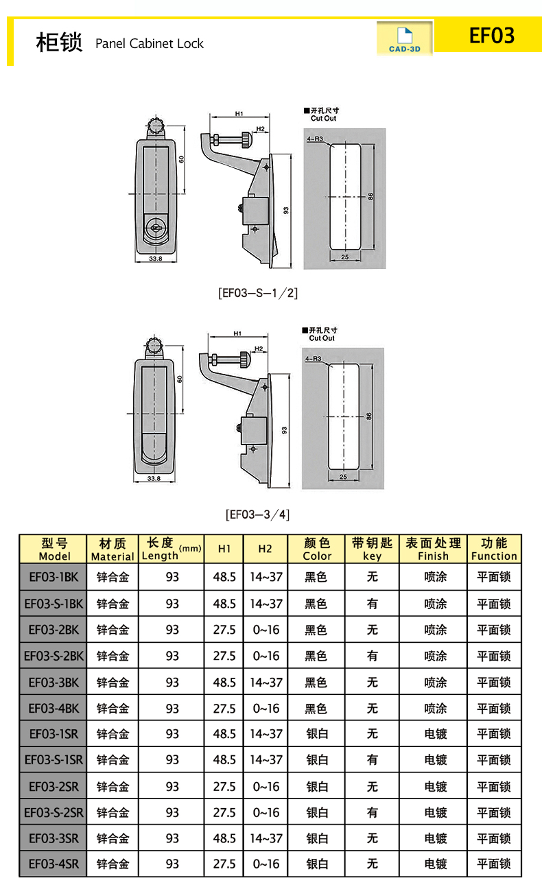 | EF03-3BK | 平面鎖 | 鋅合金 | 93 | 黑色 | 無 | 噴涂 | 161.71 | 下載 | ||||